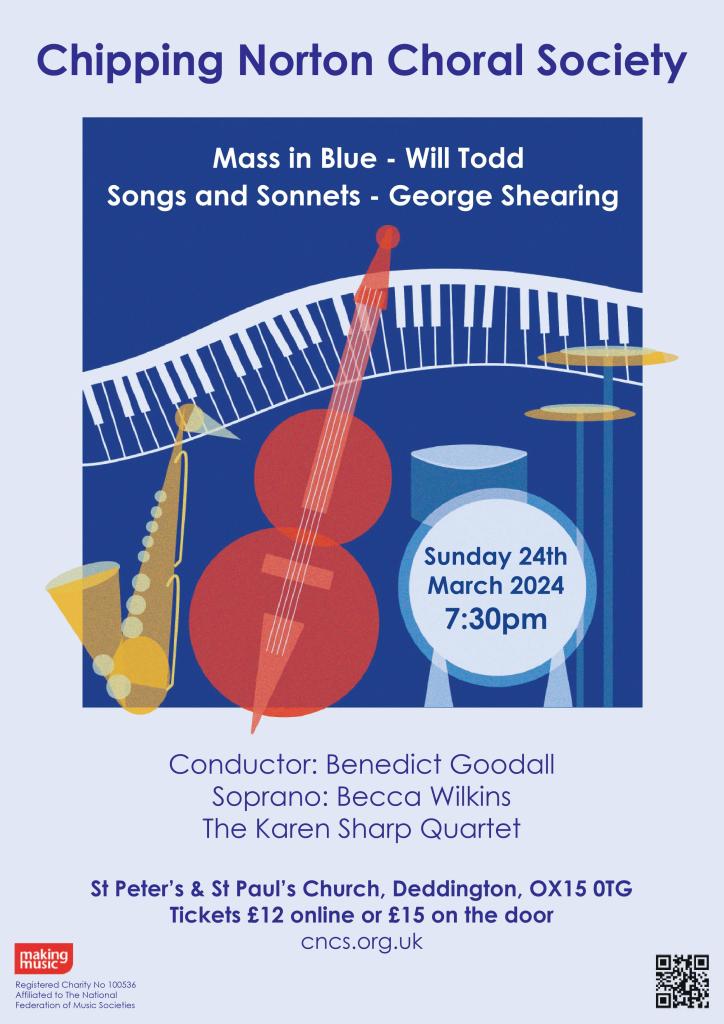 Then, on Sunday 24th, Chipping Norton Choral Society sing some choral jazz – George Shearing’s Songs and Sonnets from Shakespeare, and Will Todd’s fiendishly difficult Mass in Blue. We’re joined by a professional jazz quartet, the Karen Sharp Jazz Quartet, and a great soprano soloist Becca Wilkins. The rehearsal on Wednesday sounded fabulous, so this is not one to miss!